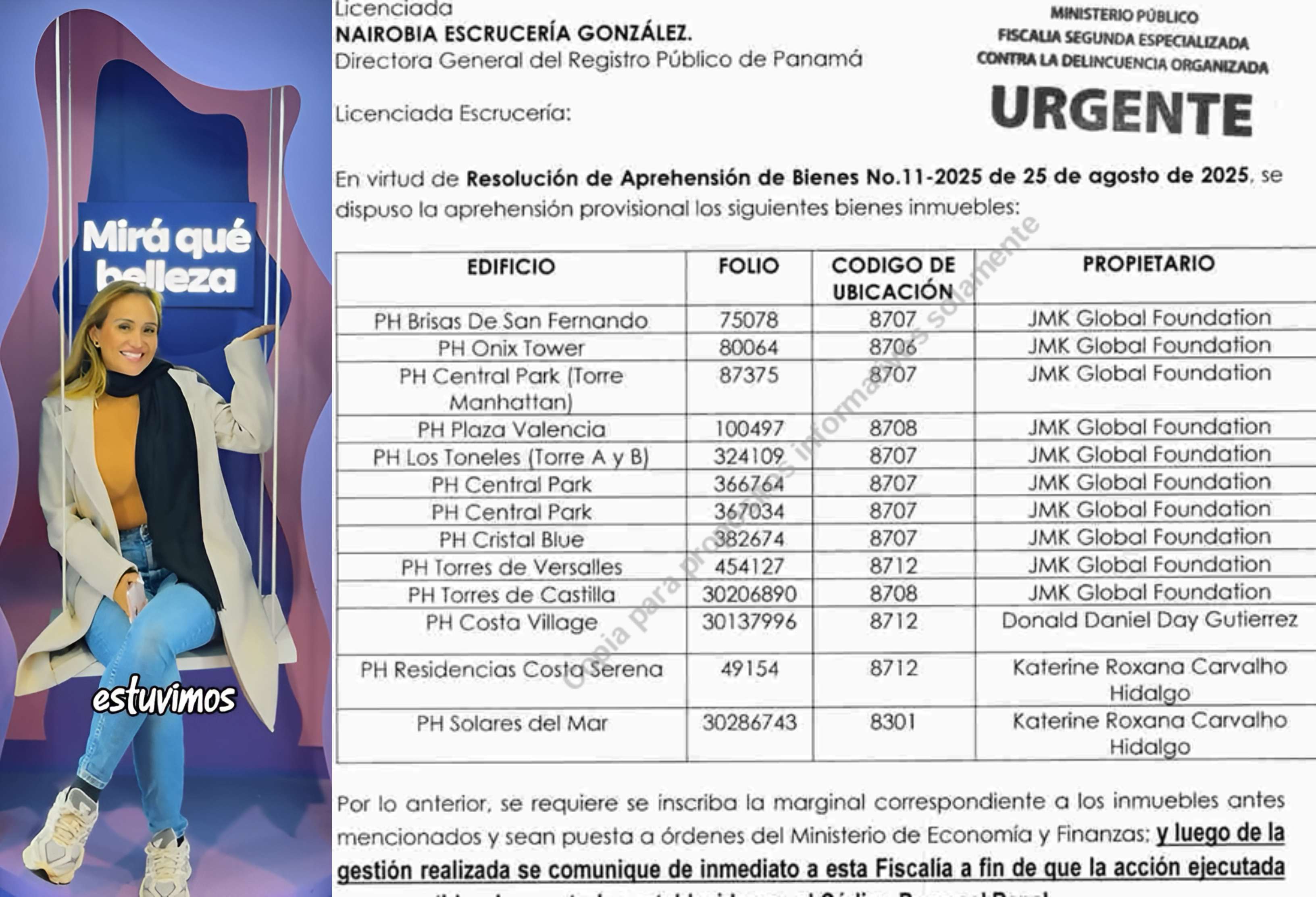 De las 13 propiedades incautadas por el Ministerio Público, mediante resolución del 25 de agosto de 2025, diez están a nombre de JMK Global Foundation, una fundación creada el 6 de abril de 2022, mediante escritura número 3801, de la cual Katerine Roxana Carvalho Hidalgo es su representante legal y miembro fundador. Estos inmuebles estaban ubicados en los PH Brisas de San Fernando, PH Onix Tower, PH Central Park (Torre Manhattan), PH Plaza Valencia, PH Los Toneles (Torre A y B), PH Cristal Blue, PH Torres de Versalles, PH Torres de Castilla y otros dos en el PH Central Park.