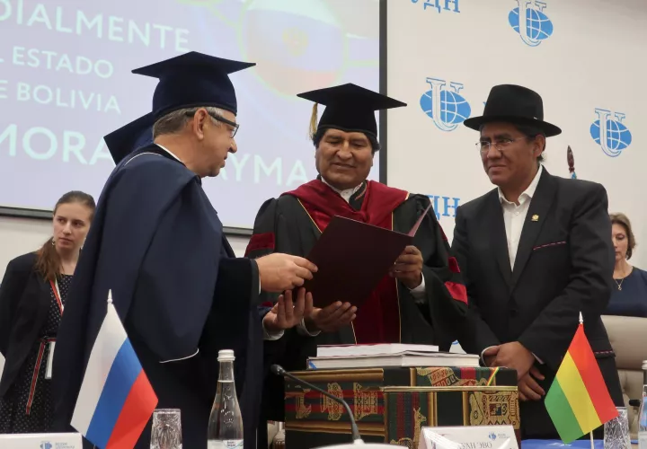 El presidente de Bolivia, Evo Morales, fue investido este jueves doctor honoris causa por la Universidad Rusa de la Amistad de los Pueblos (RUDN).