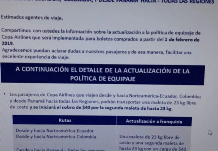 Los pasajeros de Copa Airlines que viajen desde y hacia Norteamérica - Ecuador, Colombia; desde Panamá hacia todas las regiones, podrán transportar un maleta de 23 kg. libre de costo y se iniciará el cobro de $40 por la segunda maleta de hasta 23 kg.