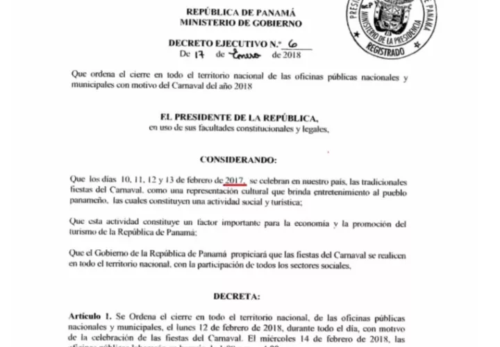 En la Gaceta Oficial No. 28446-A aparece el Decreto Ejecutivo No. 6 del 17 de enero de 2018, que ordena el cierre de oficinas públicas por el Carnaval 2018, en la cual por error se colocó en la parte de "considerando" que los Carnavales se celebrarán en Panamá los días 10, 11, 12 y 13 de febrero de 2017, o sea, el año que acaba de terminar.