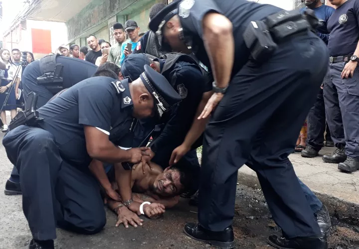 Cuando descendió utilizando un cable como especie de liana y se desparramó en el piso, los policías lo atraparon, lo llevaron al hospital Santo Tomás, donde lo suturaron y lo refirieron al loquero.
