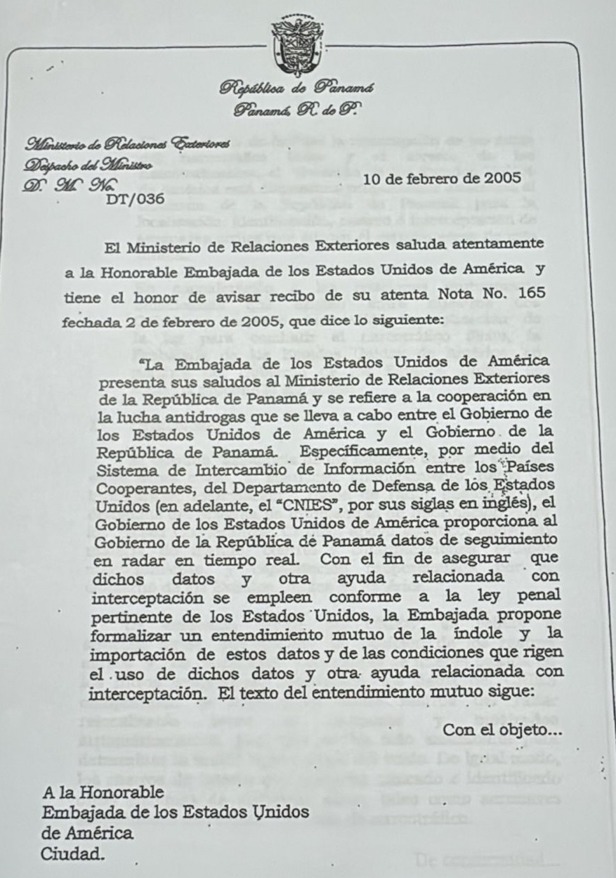 El gobierno de Torrijos también firmó el 10 de febrero de 2005 un acuerdo de entendimiento para la asistencia con el Gobierno de Estados Unidos para datos de seguimiento por radar en tiempo real. Este acuerdo fue firmado en ese entonces por el Ministerio de Relaciones Exteriores de Panamá.