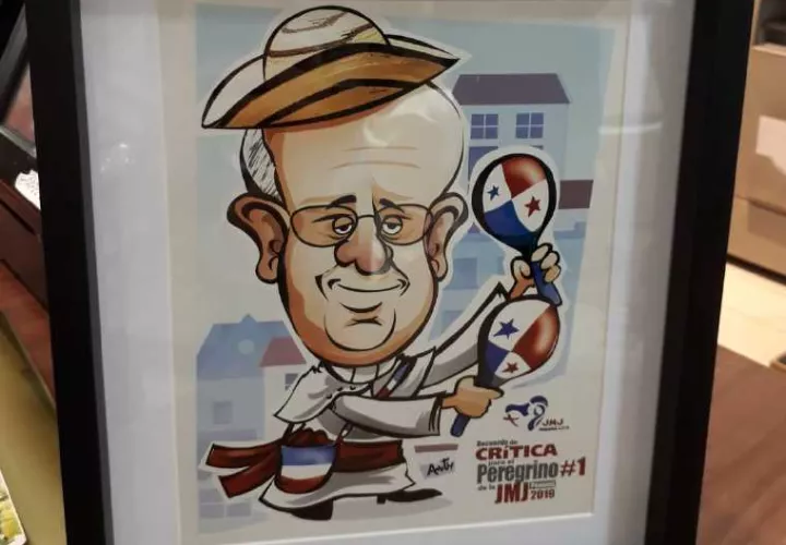 La caricatura a colores muestra al papa con un sombrero típico panameño a “la pedrá”, sosteniendo dos maracas, con el pendón nacional y la leyenda Peregrino#1 de la JMJPANAMA 2019”.