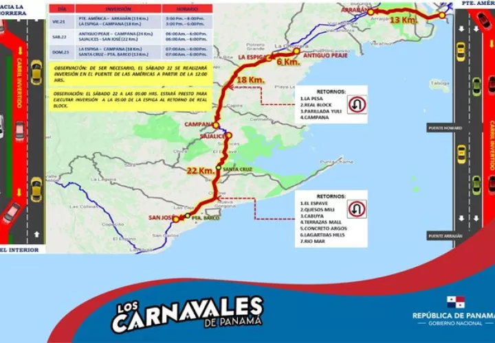 Viernes 21 de febrero: La inversión de carriles inicia a las 3:00 p.m. desde el Puente de las Américas hasta Arraiján (con 13 km.). Inicia con tres carriles desde el puente y luego se convierte en 4 carriles desde la antigua base de Howard hasta Arraiján Cabecera.