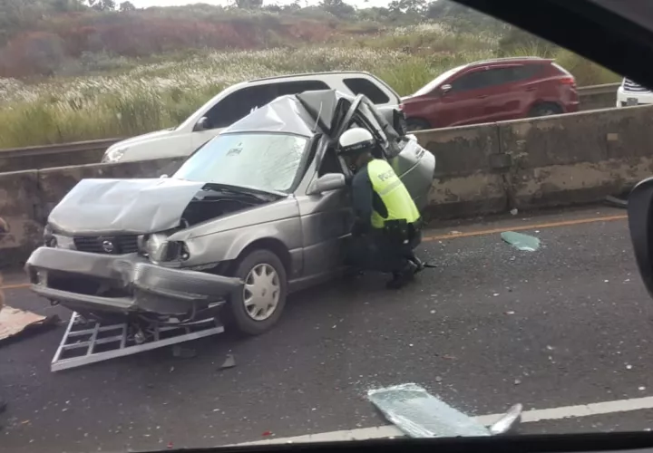 Un hombre se encuentra atrapado entre los hierros retorcidos de un auto tipo sedán, tras un accidente ocurrido en la autopista Arraiján-La Chorrera a la altura de Biqué en dirección a Panamá Oeste.