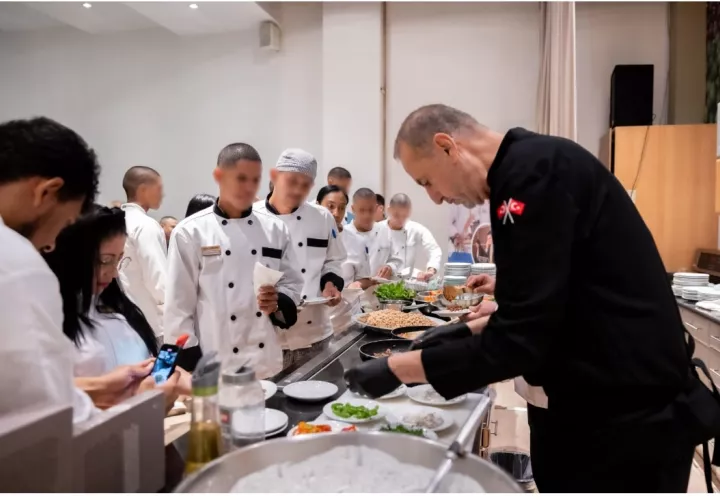 Los jóvenes. que forma parte del Instituto de Estudios Interdisciplinarios del Ministerio de Gobierno, fueron espectadores de la demostración culinaria a cargo del reconocido chef turco Tahir Tekin Öztan, propietario de la cadena de restaurantes Shan y fundador de la Asociación para la Protección de la Cocina Anatolia.