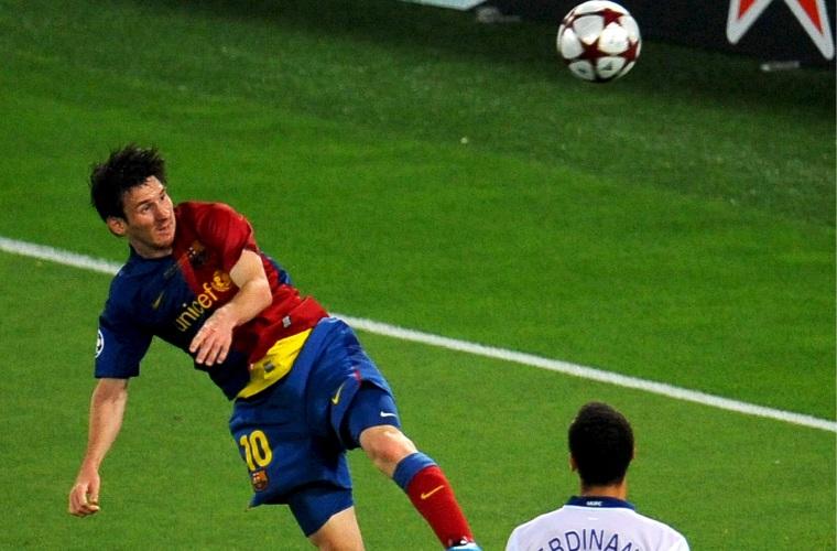 Messi impactó el balón de cabeza a más de dos metros y medio de altura tras un pase de Xavi Hernández. El argentino perdió una bota en su salto y dejó una imagen para la historia del fútbol.