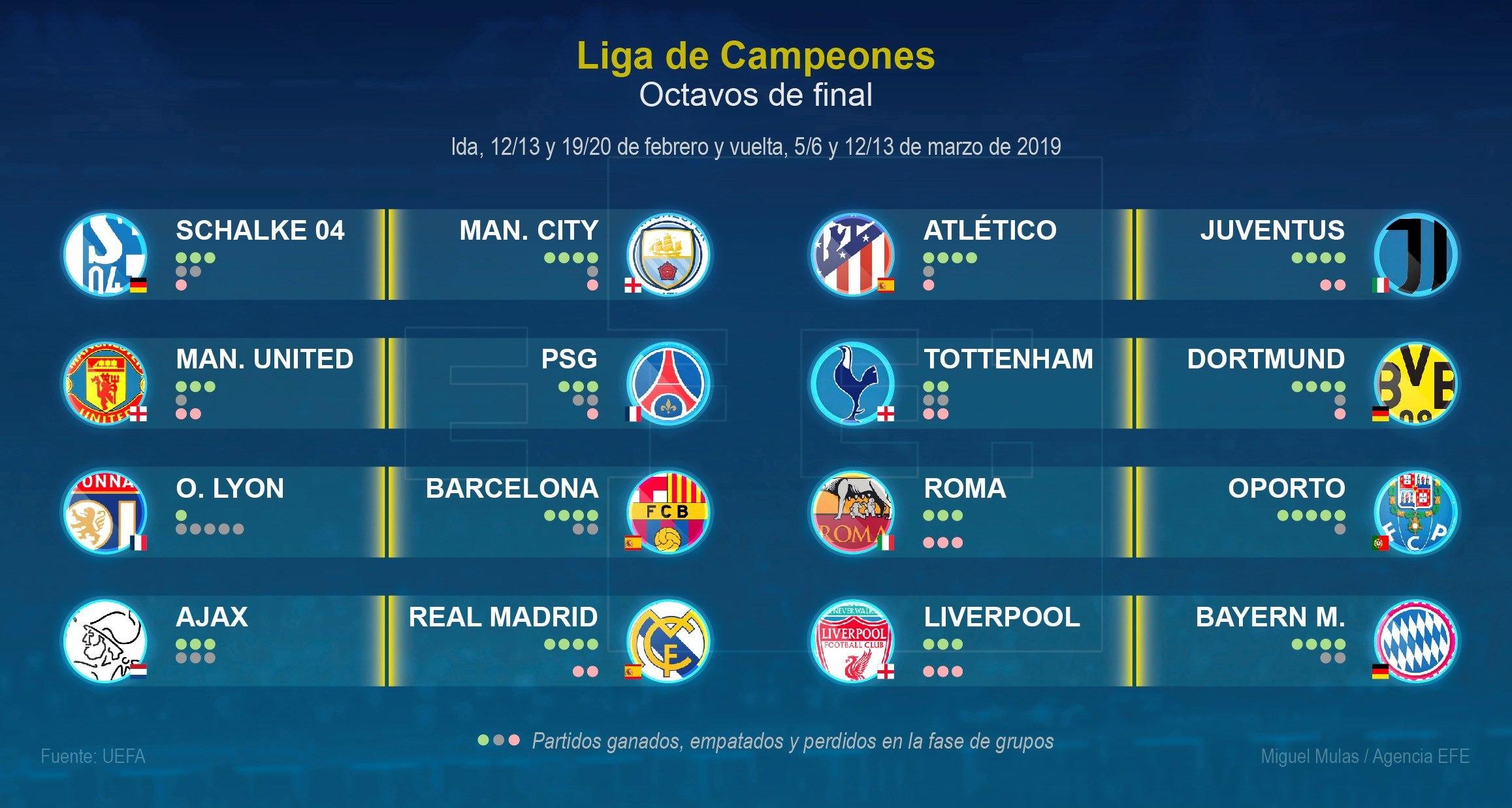 El Ajax y el Lyon serán los rivales de Real Madrid y Barcelona en los octavos de final de la Liga de Campeones 2017/18, según el sorteo celebrado este lunes en la sede de la UEFA en Nyon, mientras que el Atlético de Madrid, anfitrión de la final, se medirá al Juventus de Cristiano Ronaldo.