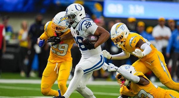 Daniel Jones lanzó para 288 yardas y dos anotaciones, Jonathan Taylor tuvo su tercer juego de tres touchdowns de la temporada y los Colts de Indianápolis vencieron 38-24 a los Chargers de Los Ángeles, logrando su sexta victoria, la mayor cantidad en la NFL.