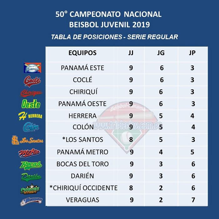 Chiriquí y Panamá Oeste ganaron sus partidos de anoche, mientras que Coclé y Panamá Este cayeron, y esa combinación de resultados dejó a estos cuatro equipos juntos en el primer lugar de la tabla de posiciones del Campeonato Nacional de Béisbol Juvenil 2019.