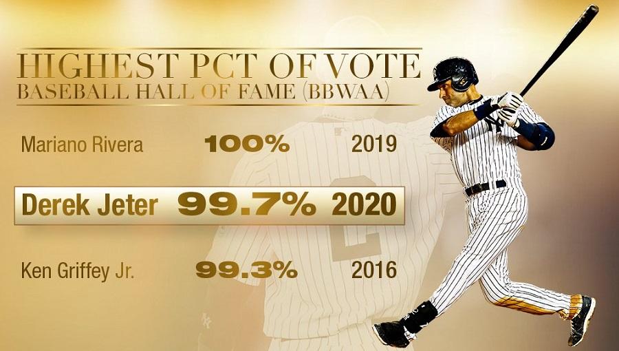 El emblemático capitán de los Yanquis de Nueva York apareció en 396 de las 397 papeletas depositadas por la Asociación de Cronistas de Béisbol de Norteamérica (BBWAA), quedándose a una del logro alcanzado por su compañero en los Yanquis de Nueva York, Mariano Rivera.