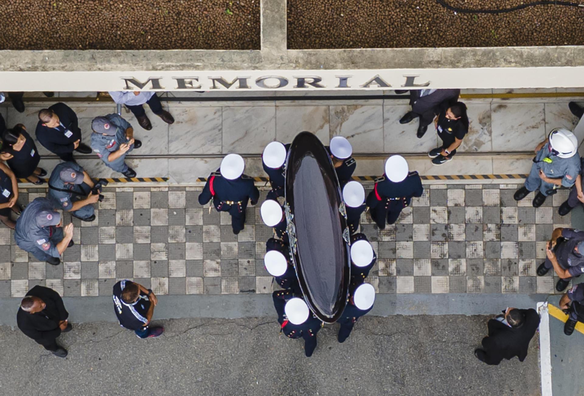 Allí, los bomberos bajaron el féretro del camión y los ocho cadetes de la Policía Militar lo volvieron a cargar a hombros hasta el interior del recinto, entre los acordes lánguidos de corneta.