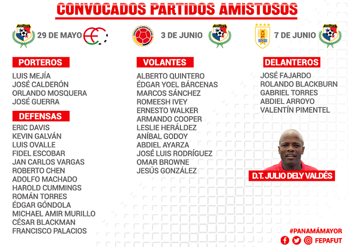 Julio Dely Valdés, técnico de la selección nacional, presentó el listado de los jugadores convocados elegibles de Panamá con miras a encarar los duelos de preparación ante el País Vasco (29 de mayo), Colombia (3 de junio) y Uruguay (7 de junio).