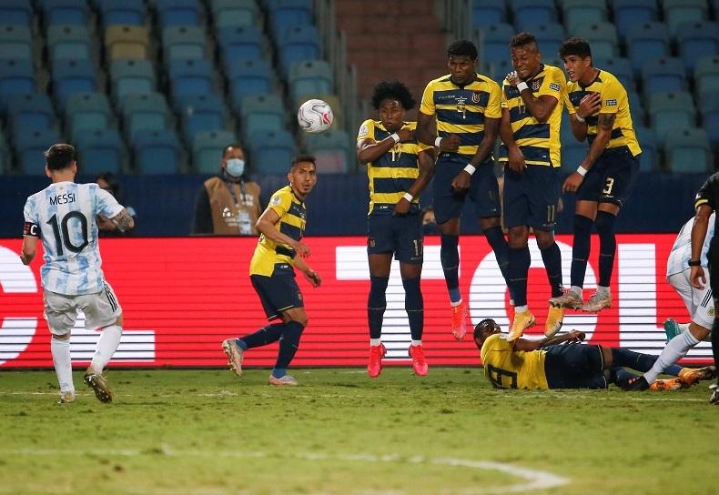 Un golazo de tiro libre de Lionel Messi y dos asistencias llevaron este sábado a Argentina a una goleada por 3-0 sobre Ecuador y a las semifinales de la Copa América, instancia en la que se citará con Colombia este martes en Brasilia.