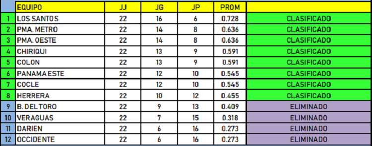 Luego de la última jornada de la ronda regular, celebrada la noche del martes, quedaron definidas las posiciones de los ocho clasificados a la segunda fase. Las otras dos series las protagonizarán Panamá Metro frente a Coclé y Chiriquí se medirá con Colón, ambas contiendas a partir del día viernes.