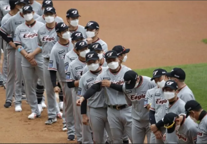 Los jugadores de los Hanwha Eagles con mascarillas previo al inicio del partido en Incheon.