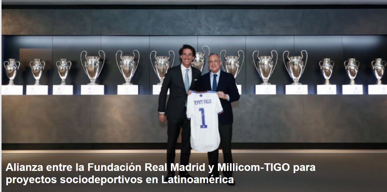 El CEO de la corporación Millicom-TIGO, Mauricio Ramos y el presidente del Real Madrid, Florentino Pérez se reunieron en la Ciudad Real Madrid donde firmaron una alianza que se mantendrá los próximos cinco años para facilitar la sostenibilidad de más de 65 proyectos sociodeportivos de la Fundación Real Madrid en nueve países de Latinoamérica y EE.UU.
