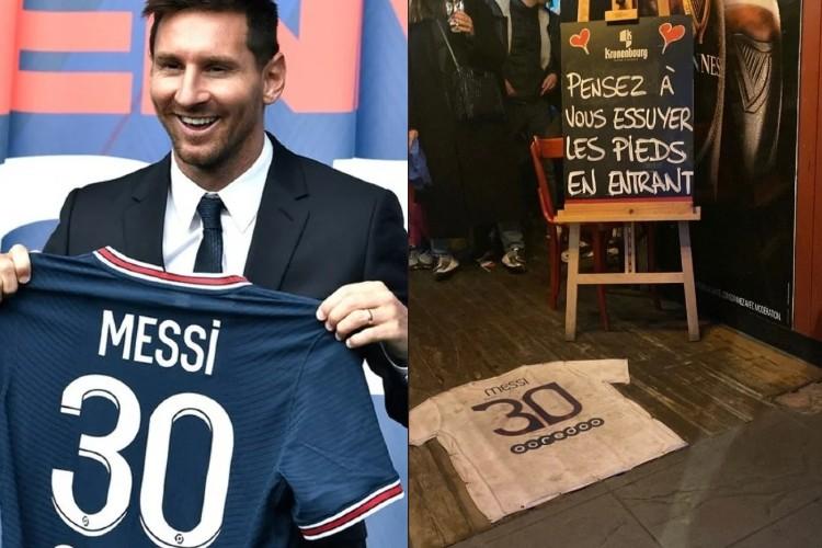 En las redes sociales, se ha hecho viral una foto en la que se ve una réplica de la camiseta del PSG con el nombre de Messi y el número 30 a la entrada de un bar bajo un cartel con la frase: "No olvides limpiarte los pies antes de entrar".
