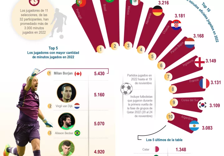 Qatar 2022: Las selecciones con mayor promedio de minutos jugados