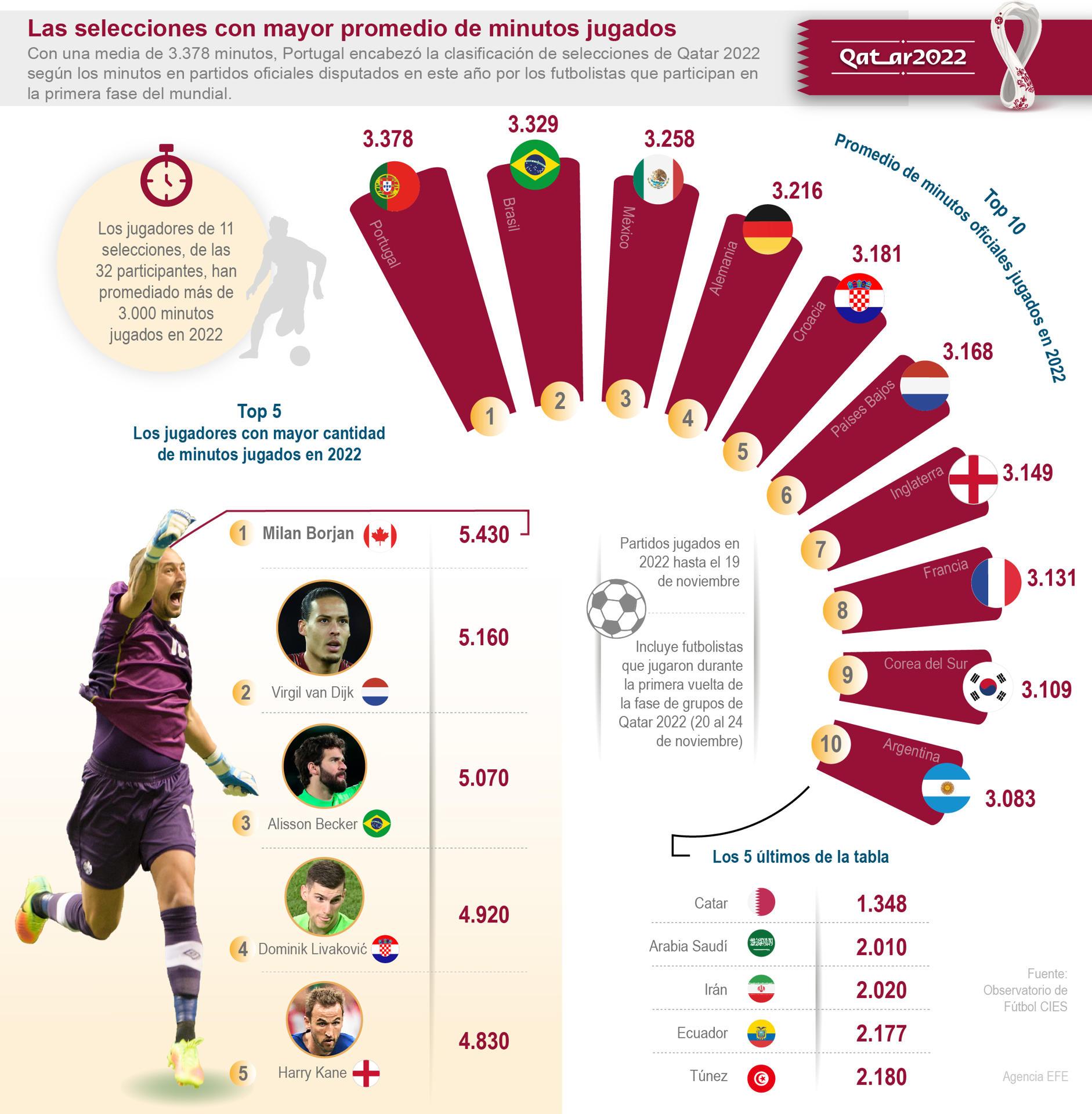 Qatar 2022: Las selecciones con mayor promedio de minutos jugados