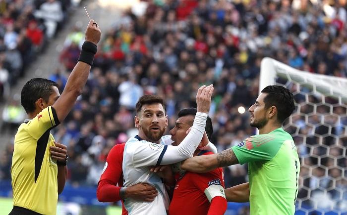 Messi recibió la tarjeta roja en el primer tiempo, tras intercambiar empujones con Gary Medel, volante chileno, quien fue expulsado también.