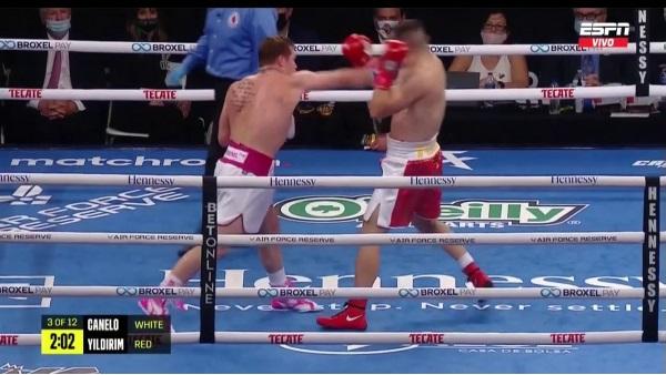 Desde un inicio ‘Canelo’ Álvarez dominó ampliamente la pelea conectando golpes precisos al rostro y a la zona media de Yildirim. Ya en el tercer asalto, los golpes del mexicano hicieron daño al turco, al ser derribado, aunque logró levantarse para sobrevivir. No obstante, no salió en el cuarto round y de esta manera Álvarez se llevó la victoria.