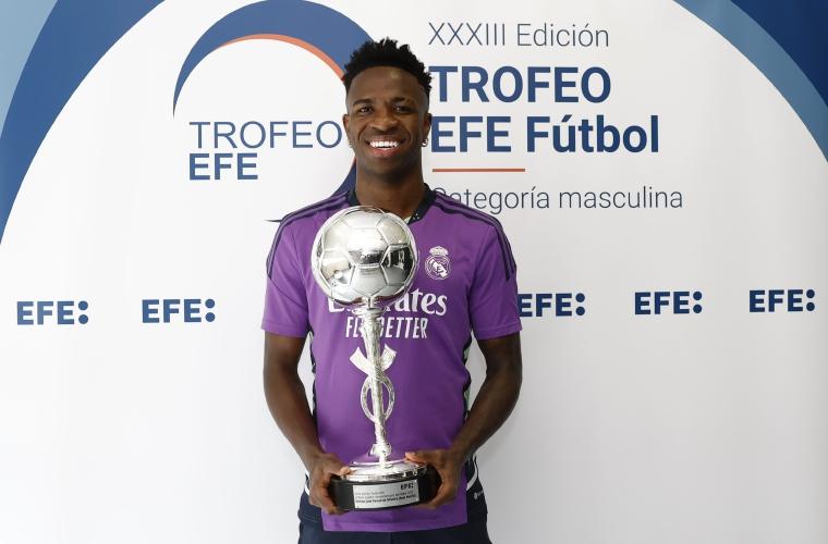 El brasileño Vinícius Junior ha sido galardonado con el XXXIII Trofeo EFE al mejor jugador Iberoamericano por la redacción de deportes de la Agencia, que destaca su importancia dentro de los éxitos conseguidos con el Real Madrid, llegando a dobles dígitos de goles y asistencias.