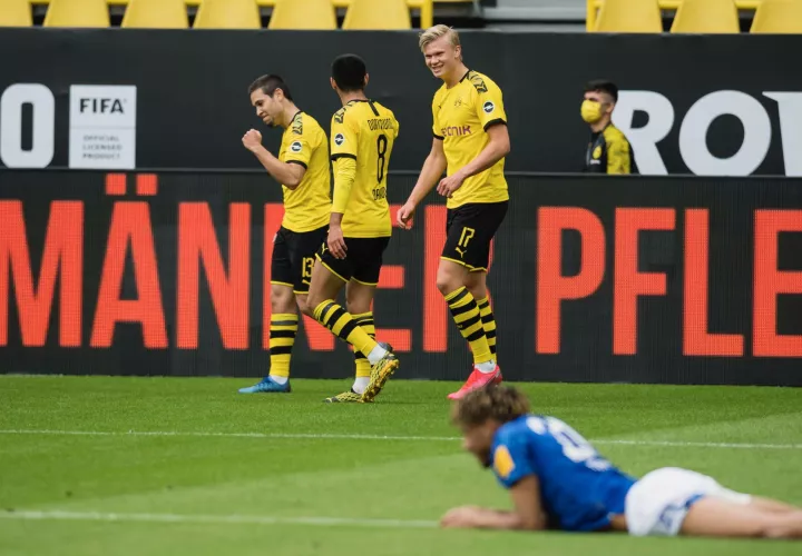 El balón volvió a rodar en los estadios alemanes, aunque sin público en la grada, por lo que los hinchas amarillos tuvieron que festejar a distancia los tantos del noruego Erling Haaland (minuto 29) , el doblete del portugués Raphael Guerreiro (45 y 63) y el gol del belga Thorgan Hazard (49).