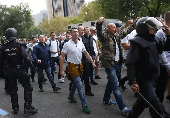 Aficionados ultras del Legia Varsovia lanzaron botellas a la Policía esta tarde en los alrededores del estadio Santiago Bernabéu antes del comienzo del partido de la Liga de Campeones entre el Real Madrid y el equipo polaco.