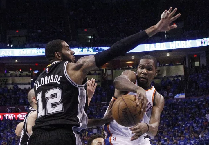 Kevin Durant anotó 37 puntos, Russell Westbrook agregó 28 y el Thunder de Oklahoma City derrotó el jueves 113-99 a los Spurs de San Antonio para ganar 4-2 la serie de segunda ronda de la postemporada de la Conferencia del Oeste.