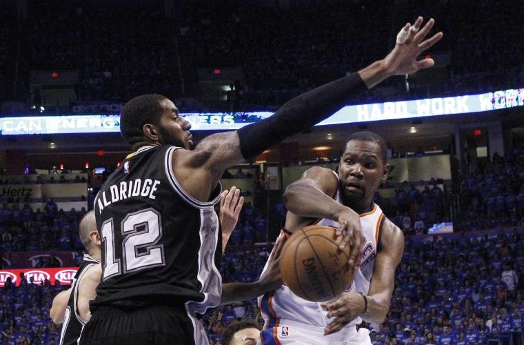 Kevin Durant anotó 37 puntos, Russell Westbrook agregó 28 y el Thunder de Oklahoma City derrotó el jueves 113-99 a los Spurs de San Antonio para ganar 4-2 la serie de segunda ronda de la postemporada de la Conferencia del Oeste.
