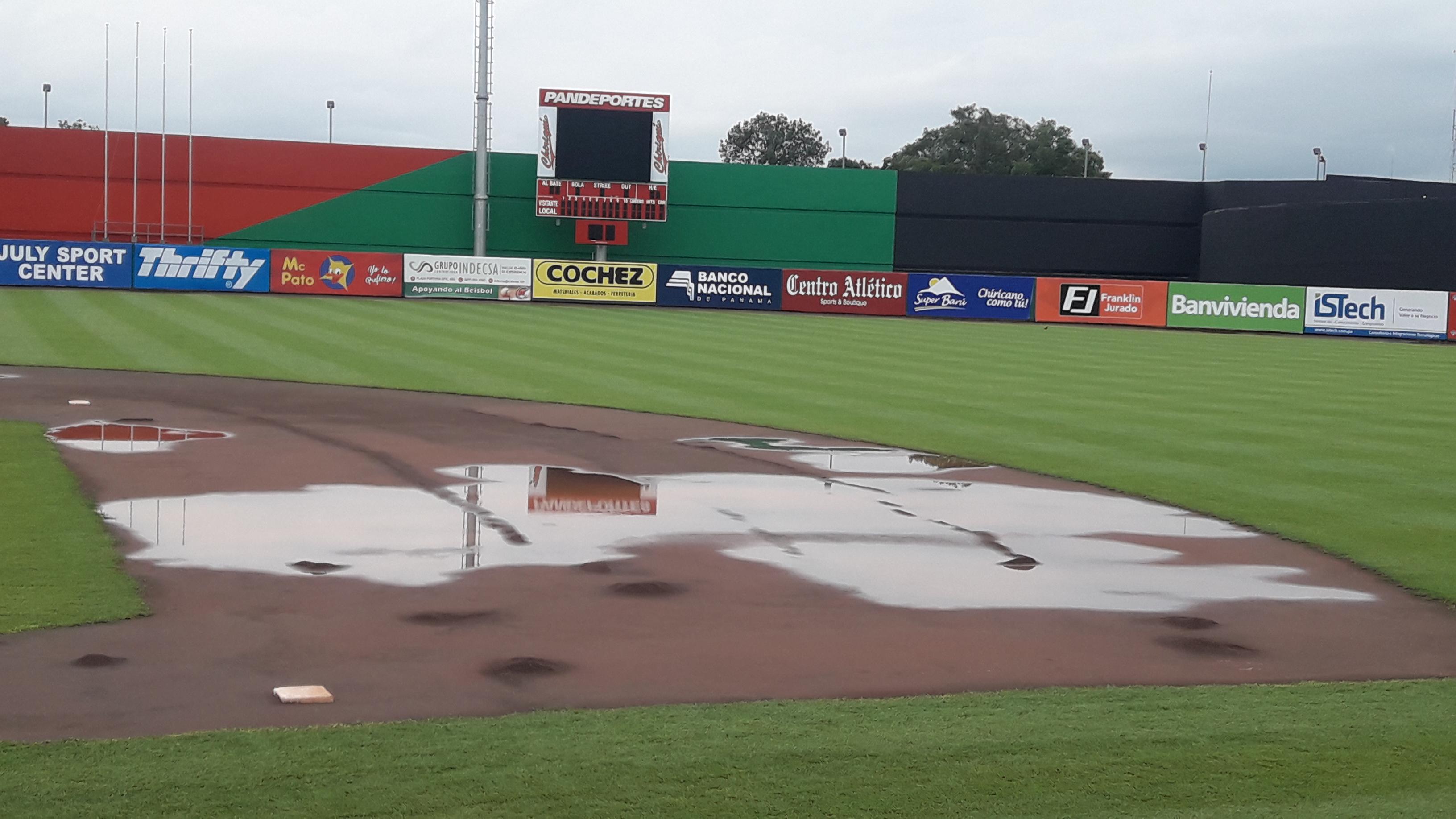 Nuevamente el estadio Kenny Serracin fue protagonista de una enorme piscina en el campo de juego, producto del fuerte aguacero que cayó sobre la ciudad de David, la tarde de este martes.