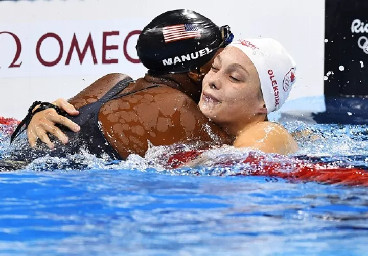 La nadadora estadounidense Simone Manuel y la canadiense Penny Oleksiak compartieron el oro en la final de los 100 libre de los Juegos Olímpicos de Río tras firmar un idéntico crono de 52.70, nuevo récord olímpico.