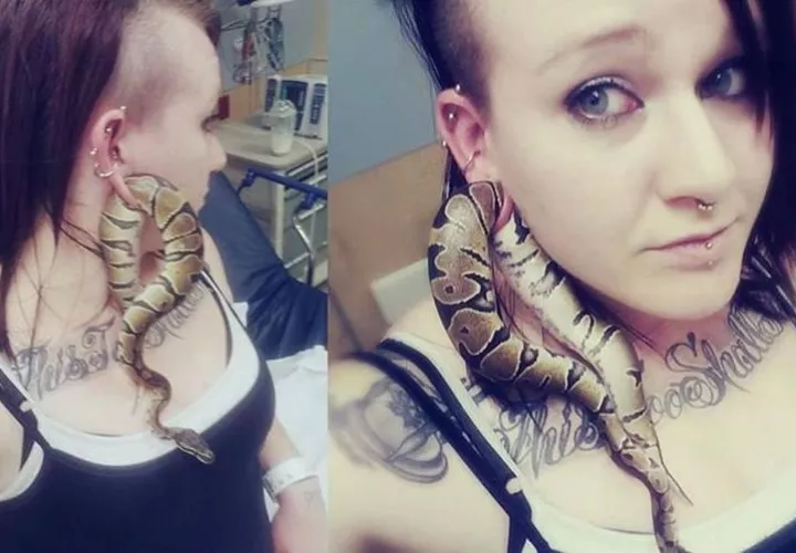 Ashley Glawe, de 17 años, fue al hospital con su mascota Bart, una pitón pequeña que se metió en el gran agujero que dejó un dilatador -a veces conocido como "túnel"- en el lóbulo de su oreja cuando se tomaba selfies.