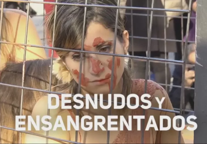 Decenas de activistas animalistas han protestado desnudos en contra de los abrigos de piel en Barcelona. Simulando un matadero humano y pintados con sangre falsa, se han concentrado para frenar una práctica que, dicen, acaba con la vida de centenares de animales cada vez que se quiere producir un único abrigo de piel.