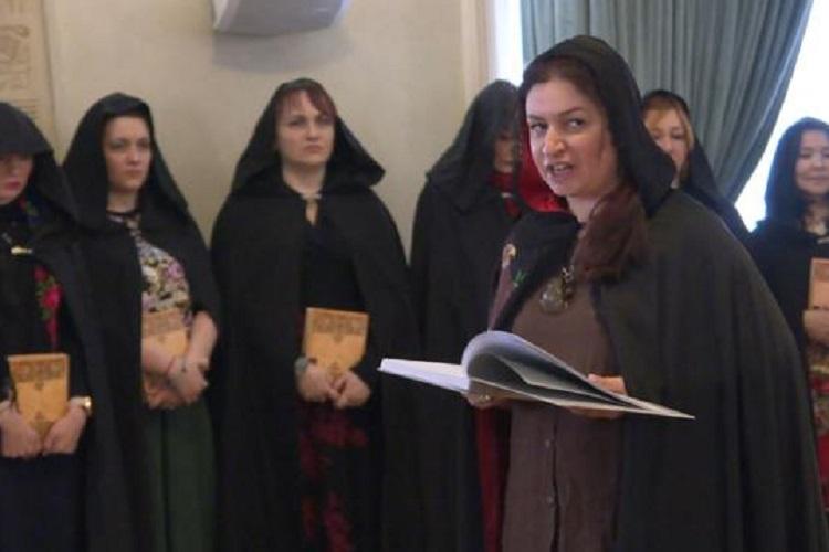 Las mujeres se aglomeraron en unn extravagante evento en el que se elevaron hechizos para reforzar la acción del presidente ruso y no faltaron maldiciones para los que le han abandonado y los que mienten en todo lo que dice.