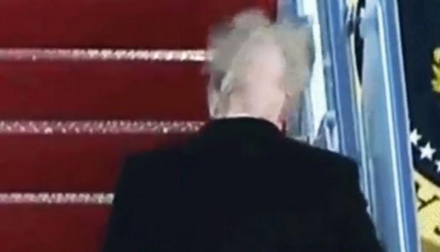 En las imágenes, que han sido difundidas en Youtube y otras redes sociales, se aprecia como el viento le levanta lo que parece ser un falso que lleva el mandatario estadounidense, justo cuando sube las escaleras hacia el avión presidencial Air Force One.
