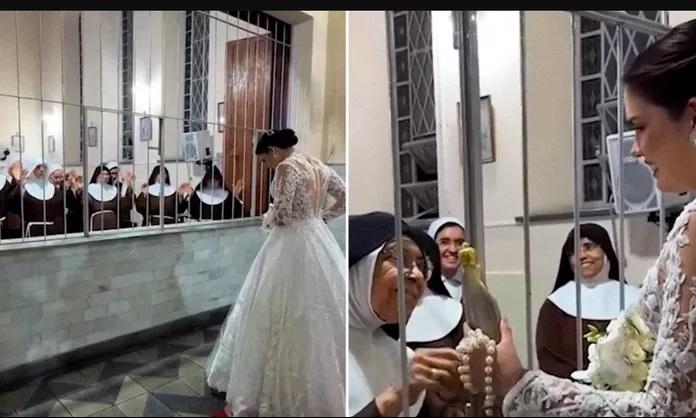 Un llamativo y conmovedor momento se ha vuelto viral en TikTok, cuando una exmonja visitó su antiguo convento el mismo día de su boda, vestida de novia y con su ramo en la mano, para rezar por última vez con sus antiguas hermanas de comunidad.