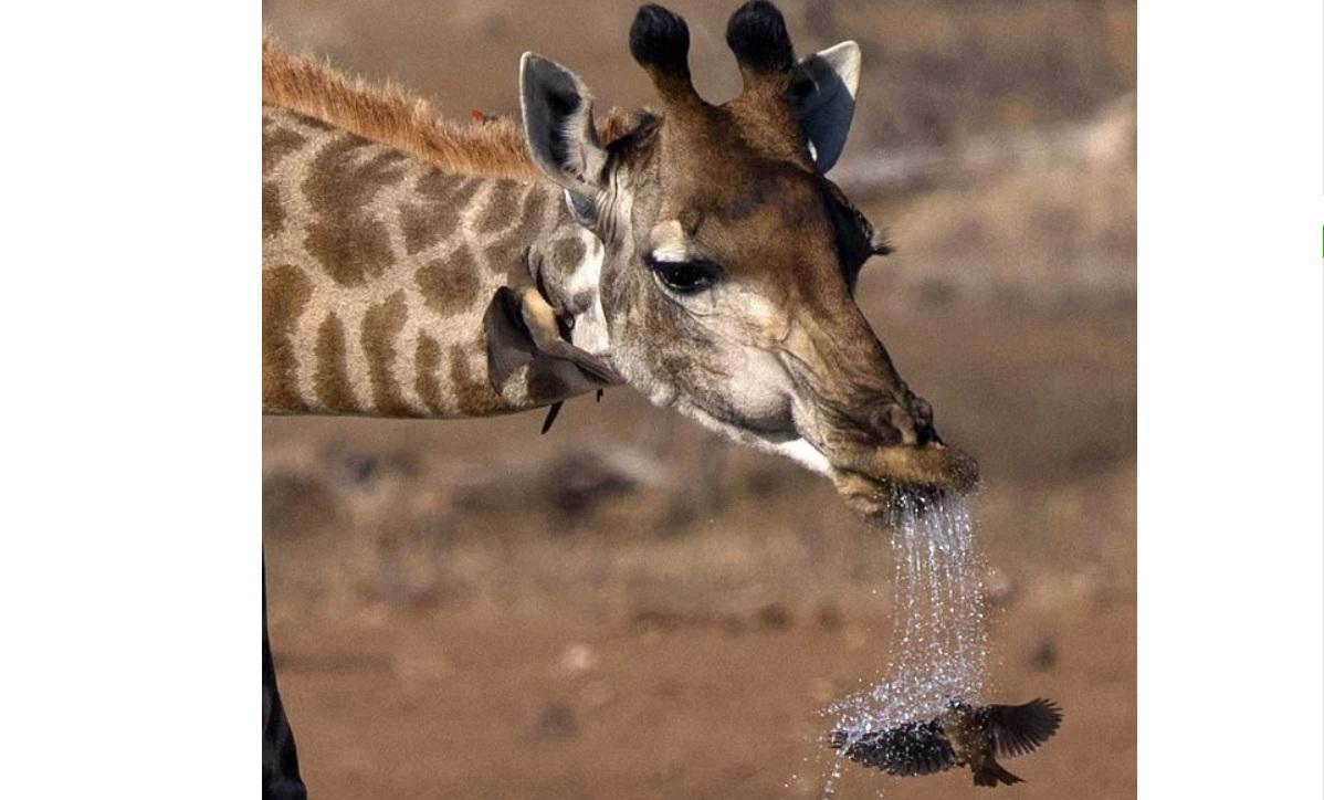 La imagen de la jirafa empapando al ave “Buphagidae” después de que el pequeño pájaro de pico rojo voló debajo de ella justo cuando el agua se derramaba de su boca en el Parque Nacional Kruger en Sudáfrica.