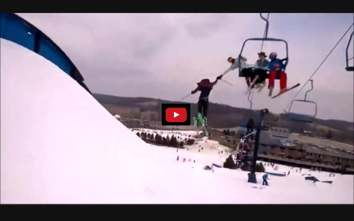 Hombre esquiando choca mano de amigo en telesilla (Video)