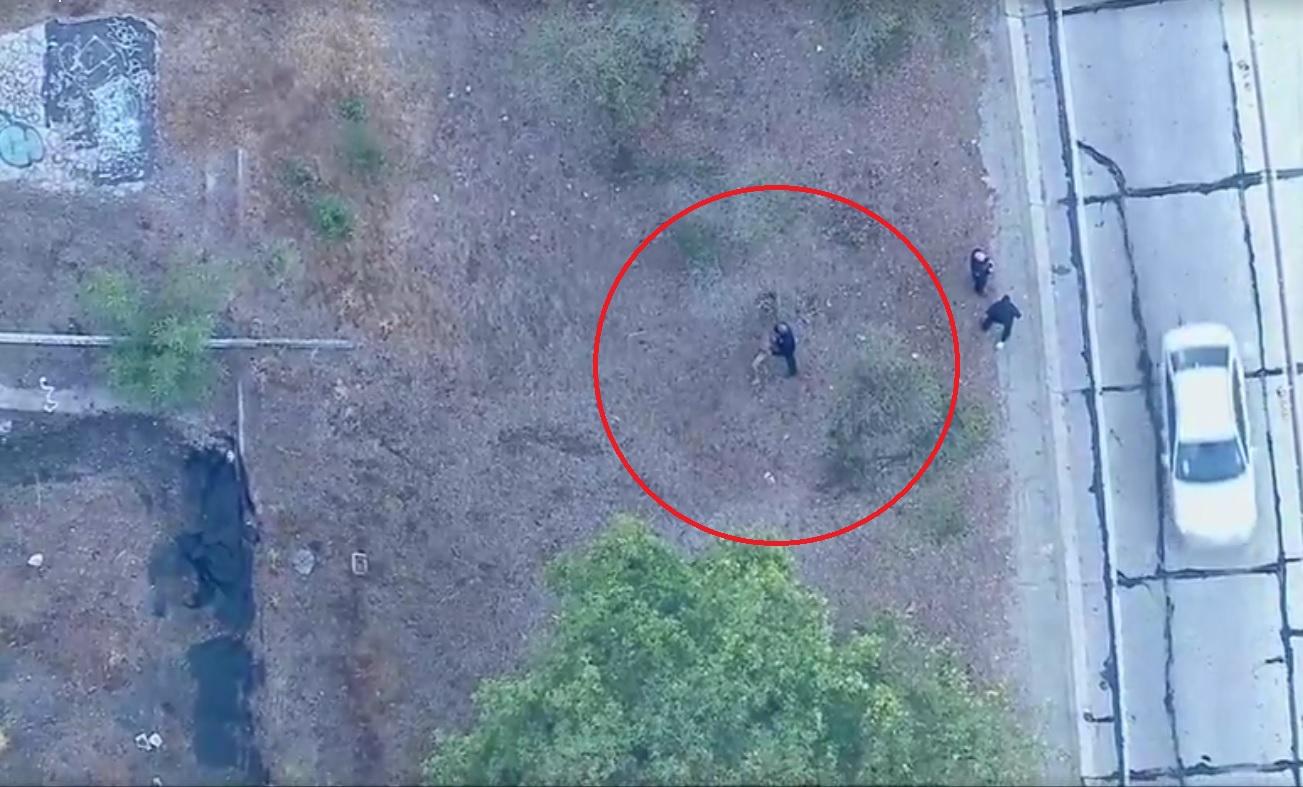Iluminado por un foco de helicóptero policial , el hombre corrió por senderos de tierra, a través de un campamento de personas sin hogar y escaló una valla.