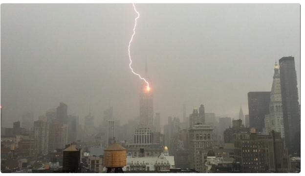 Un video impresionante muestra el momento en que cae un rayo sobre el edificio Empire State, durante una tormenta en la ciudad de Nueva York. Un cuadro del video compartido por el periodista Henrik Moltke muestra el rayo cayendo cerca de la punta del rascacielos el lunes.