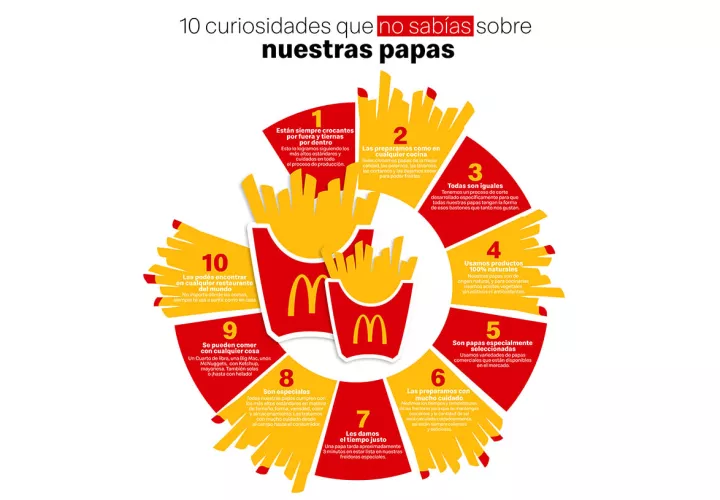 - Para comerlas, cualquier opción es válida: Según las encuestas que hace la marca, no hay una sola manera de disfrutar de las papas, sino que existen tantas formas como cantidad de fanáticos. Las más votadas son como acompañantes de Cuarto de libra, Big Mac o McNuggets. Pero también hay quienes las disfrutan solas, con kétchup, mayonesa o ¡hasta con helado!