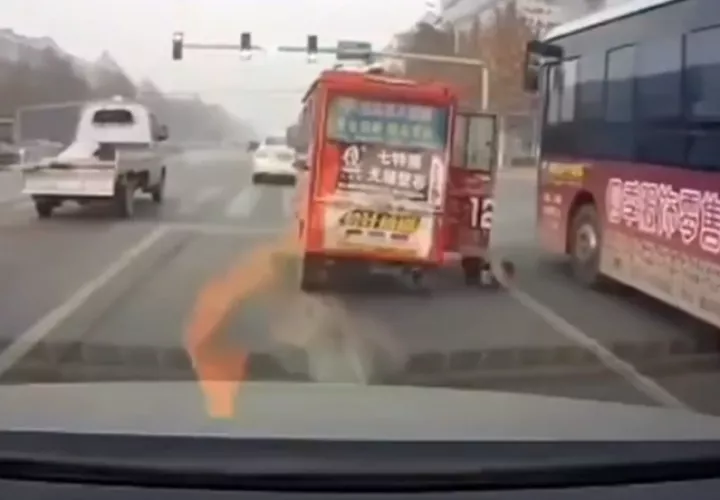 La cámara de un auto registró el pasado 10 de diciembre, algo que se podría considerar un milagro, esto luego que un niño cayera desde un vehículo en movimiento en plena carretera en Boading, China mientras otro autobús pasaba a pocos centímetros de su cabeza.