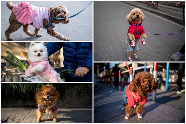 Las calles de Shanghai se transforman a veces en pasarelas de desfiles de moda canina, con un caniche con un vestido rosa, otro con las orejas teñidas de azul o un pomerania con impermeable y zapatillas, símbolo del rápido desarrollo de la clase media en China.