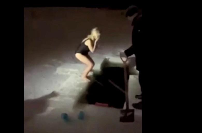 La nota explica que se había cortado un agujero en el hielo grueso y la temperatura del aire era de alrededor de -5 ° C cuando saltó. Además llevaba un traje de baño negro de una pieza y se la vio persignarse antes de taparse la nariz y saltar al río con los pies por delante.