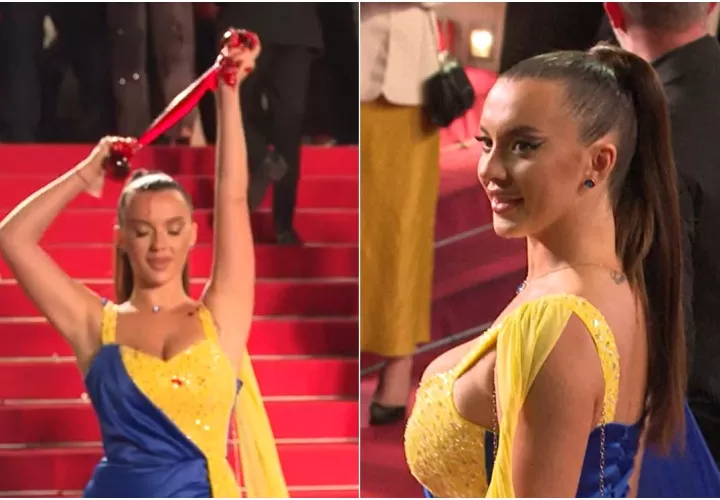 La mujer desfilaba por la alfombra roja del Festival de Cannes con un vestido con los colores de Ucrania, cuando sonrió a cámara y se cubrió con líquido rojo el rostro.