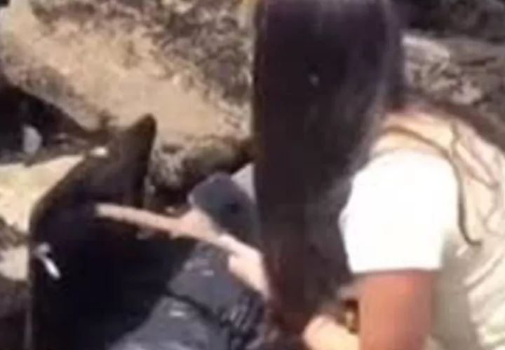En las imágenes se aprecia que una de las chicas se acerca a la maleta, abre el cierre y con la ayuda del una delgada vara levanta la tapa, lo cual le permite visualizar una bolsa negra de plástico.