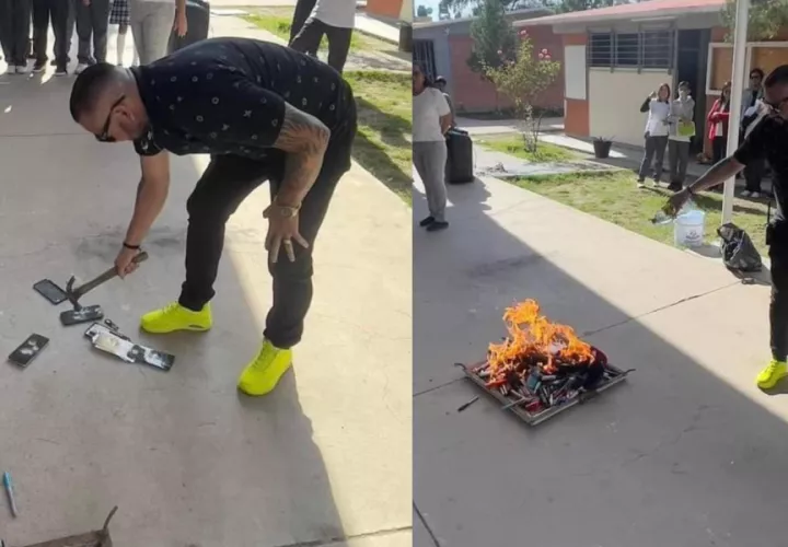 En las fotografías publicadas por la institución se puede observar cómo los profesores destruyen los celulares con un martillo y posteriormente los queman con gasolina.