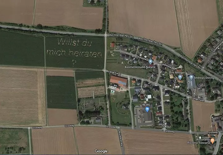 La propuesta matrimonial de un hombre tuvo una audiencia mayor de lo que había previsto, ya que apareció en una foto aérea utilizada por Google Maps.